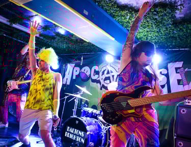 Tidal Rave are a high-voltage blast of of Electro-Rock chaos and colour, known for their high-energy, theatrical live shows packed with punchy beats, massive guitar riffs, Daft Punk-style auto-tuned vocals, and undeniably catchy hooks. Their performances are more than gigs—they're UV-lit spectacles filled with synchronised dancing, conga lines, cuddle puddles, and nonstop interaction.
